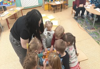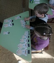 Ребята с интересом подошли к работе по помощи постройки домика для зайца,посадили целый лес елок,что бы было уютно в лесу.Угостили угощением гостя ,не обычным способом добыв ему морковки . И помогли найти друзей . Занятие прошло весело и увлекательно,в игровой форме дети закрепили понятия "один","много";"большой", "маленький".Различали и называли геометрические фигуры .